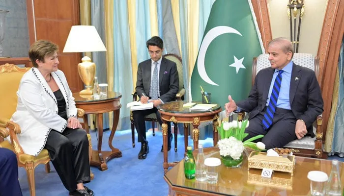 Prime Minister Shehbaz Sharif recently held a significant meeting with Managing Director of the International Monetary Fund (IMF), Kristalina Georgieva, during a visit to Riyadh, the capital of Saudi Arabia. The meeting took place on the sidelines of a special session of the World Economic Forum, where discussions centered on Pakistan’s economic trajectory and its engagement with the IMF.