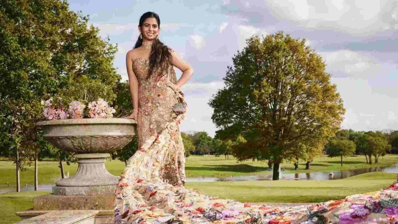 Anaita Shroff Adajania, in her Instagram post, elaborated on the intricacies of Isha’s ensemble, highlighting its sustainable ethos and incorporation of elements from Rahul’s past collections. Delicate motifs of flowers, butterflies, and dragonflies, meticulously appliquéd and embroidered using techniques such as Fareesha, Zardozi, Nakshi, and Dabka, adorned the gown, imbuing it with a profound narrative of nature’s resilience and renewal.